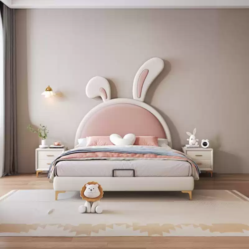 Modern Princess Rabbit Bed 1.2m Kids Bed with Carrot Design – Simple Contemporary Style Girls Bed with Bunny Ears Headboard for Children’s Room