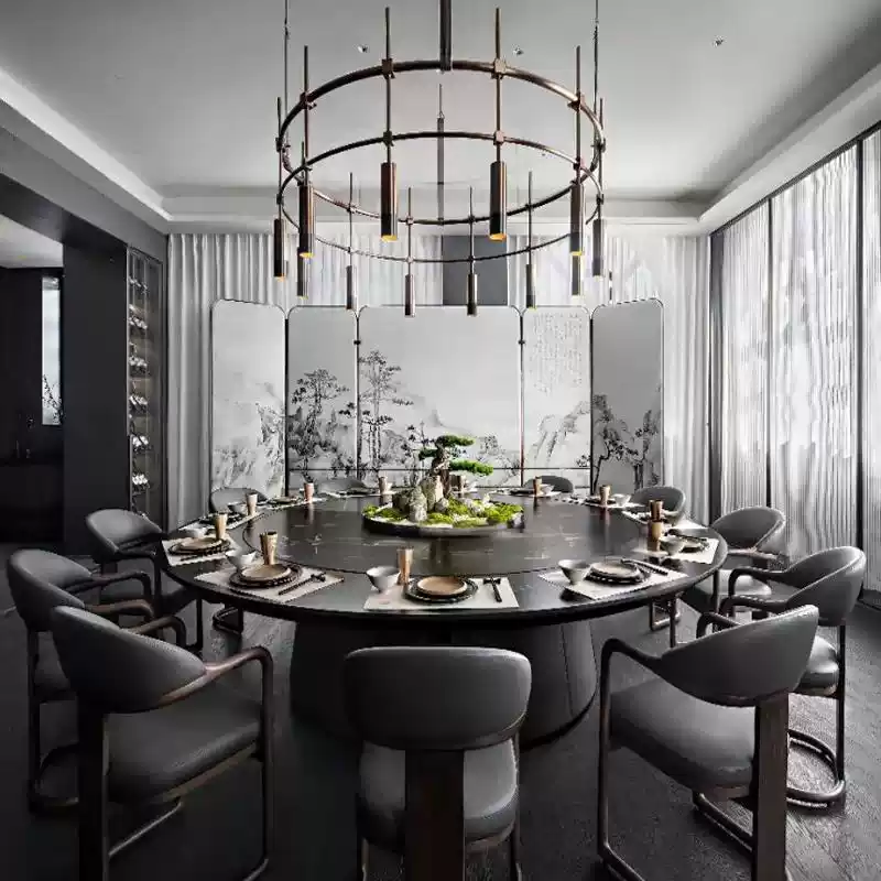 Modern Chinese Style Solid Wood 3cm Thick Marble Round Dining Table with Electric Turntable and Chairs Set for Restaurants and Hotels
