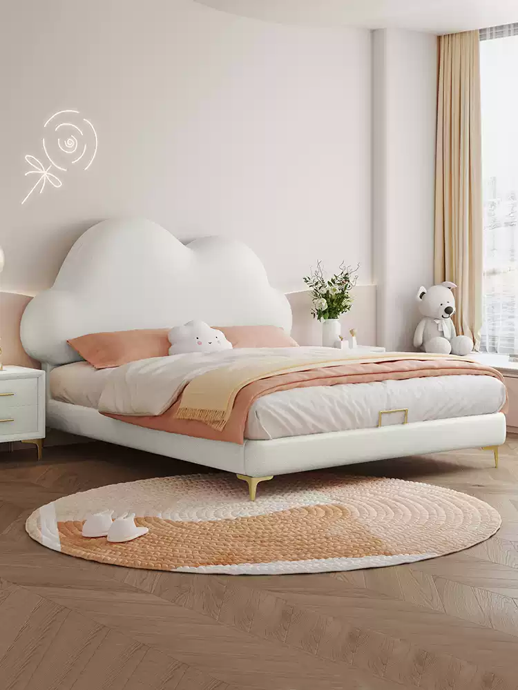 Modern Minimalist Children’s Bed with Cloud Design – Solid Wood Soft Upholstered Single Bed for Boys and Girls, Princess Style Bedroom Furniture