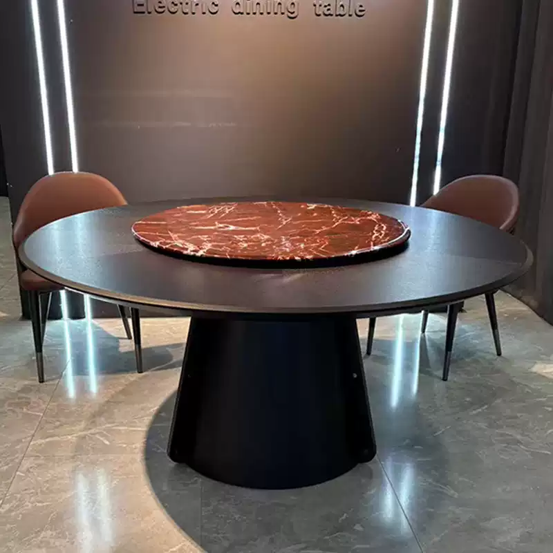 Modern Light Luxury Round Dining Table with Lazy Susan, Solid Wood New Chinese Style Rock Slab Dining Table for Home Living Room, Large Round Table with Rotating Tray