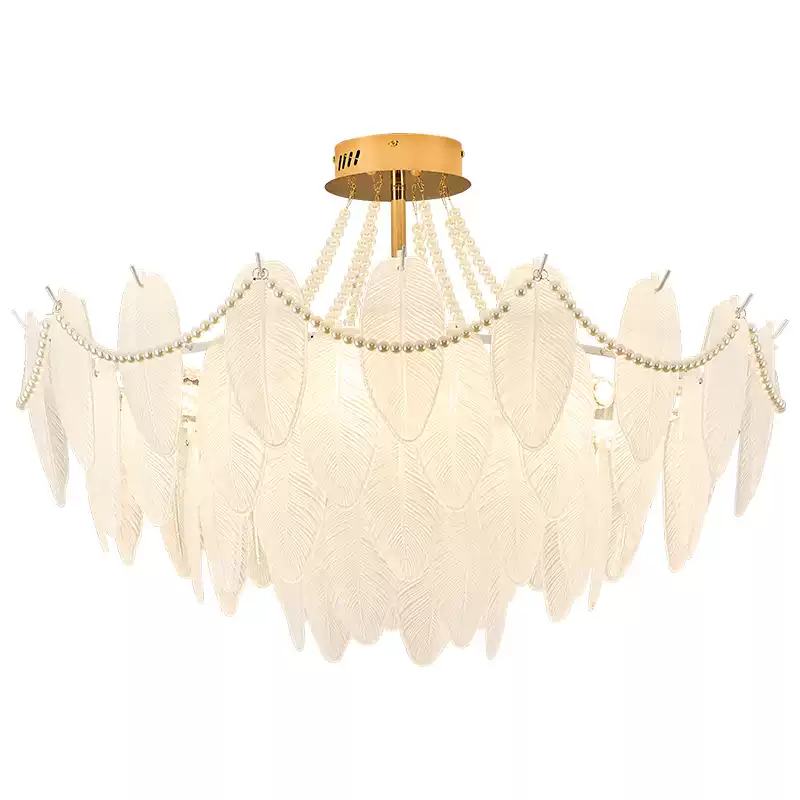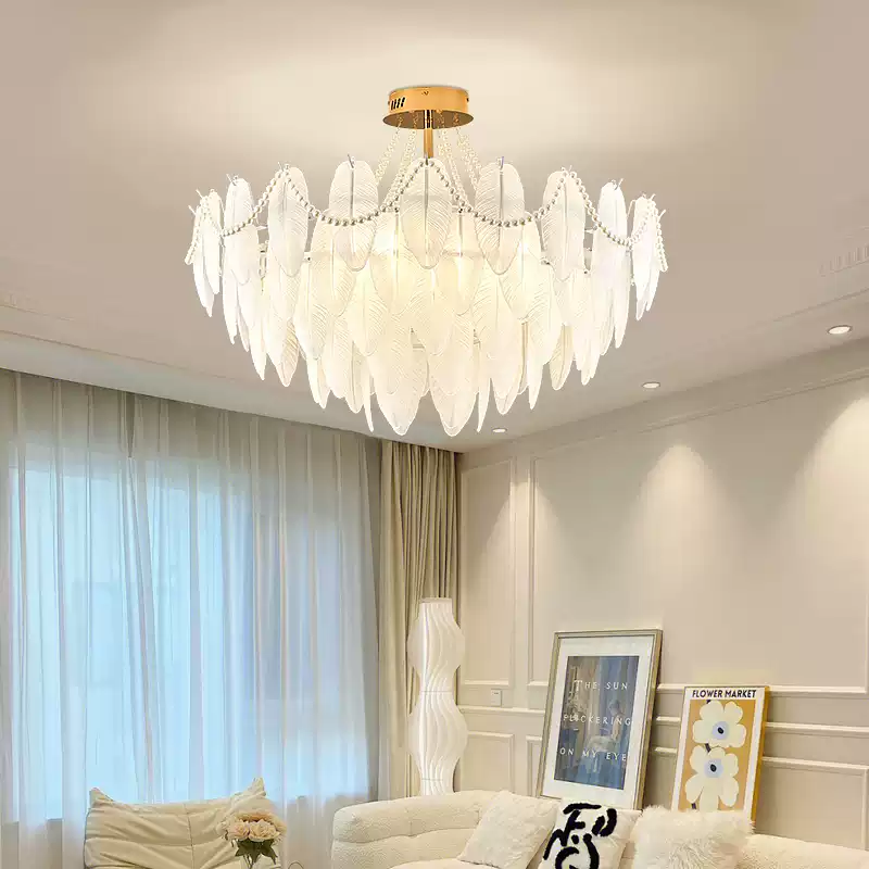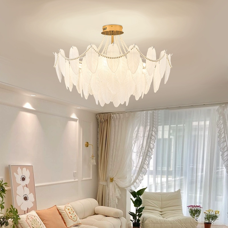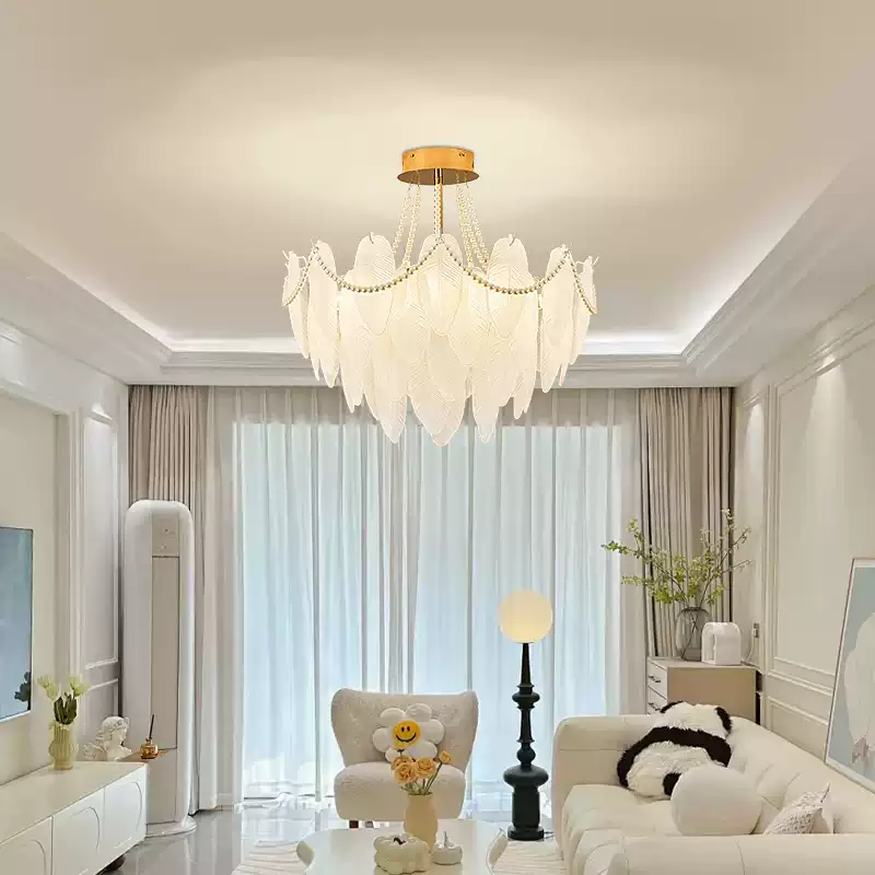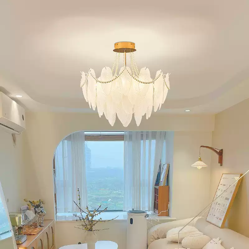 Introducing the 2025 New French Style Feather Chandelier, a stunning lighting fixture that combines elegance and modern design for your living room or bedroom. This chandelier features a delicate feather design with a pearl net overlay, creating a soft and luxurious ambiance. The milk oil wind-inspired elements add a unique, vintage touch, making it a perfect centerpiece for any home decor. Crafted with high-quality materials, this chandelier is durable and designed to enhance the aesthetic appeal of your space. Its lightweight construction ensures easy installation, while the intricate details provide a sophisticated look that complements various interior styles. Ideal for those seeking a blend of classic French charm and contemporary trends, this chandelier offers both functionality and style. With its warm lighting effect, it creates a cozy atmosphere, perfect for relaxing evenings or entertaining guests. Upgrade your home lighting with this exquisite piece that promises to be a conversation starter and a timeless addition to your decor.
