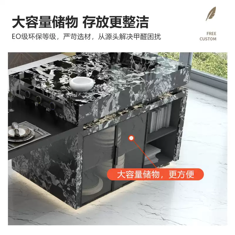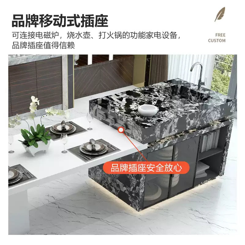 This premium kitchen island countertop combines functionality and elegance with its extendable dining table feature, crafted from luxurious natural stone materials for a durable and sophisticated look. Designed as an open-concept centerpiece for modern homes, it offers a seamless integration into residential kitchens, providing ample space for meal preparation, dining, and social gatherings. The high-end customization options allow for tailored designs to fit various kitchen layouts, enhancing both aesthetic appeal and practical utility. Its lightweight yet sturdy construction ensures easy installation and long-lasting performance, making it an ideal choice for those seeking a blend of style and convenience in their kitchen environment. Perfect for enhancing home value and creating a welcoming atmosphere, this product is engineered to meet the demands of contemporary living with its versatile and stylish design.
