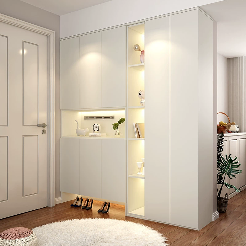 This customized shoe cabinet is a premium, wall-mounted storage solution designed for modern homes, offering a sleek and minimalist aesthetic with gold accents that add a touch of luxury. Perfect for entryways, it provides efficient organization for shoes and other items, maximizing space in compact areas. The integrated design combines functionality with style, featuring a built-in door and hidden compartments for a seamless look. Made from high-quality materials, it ensures durability and stability, with a contemporary color scheme that complements various interior decors. Ideal for households seeking practical and stylish storage, this cabinet enhances home organization while elevating the overall ambiance with its elegant and modern appeal. Its customizable options allow for personalization to fit specific needs, making it a versatile addition to any living space.