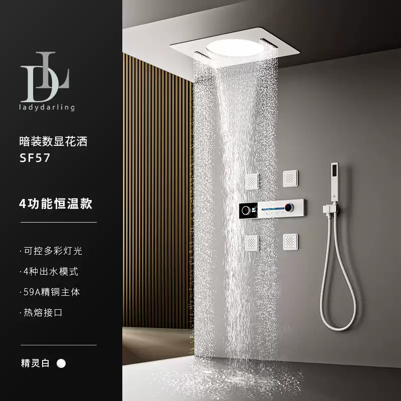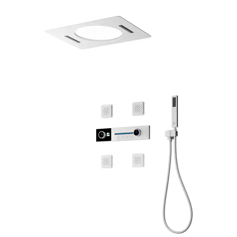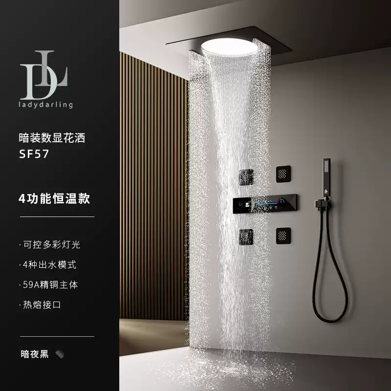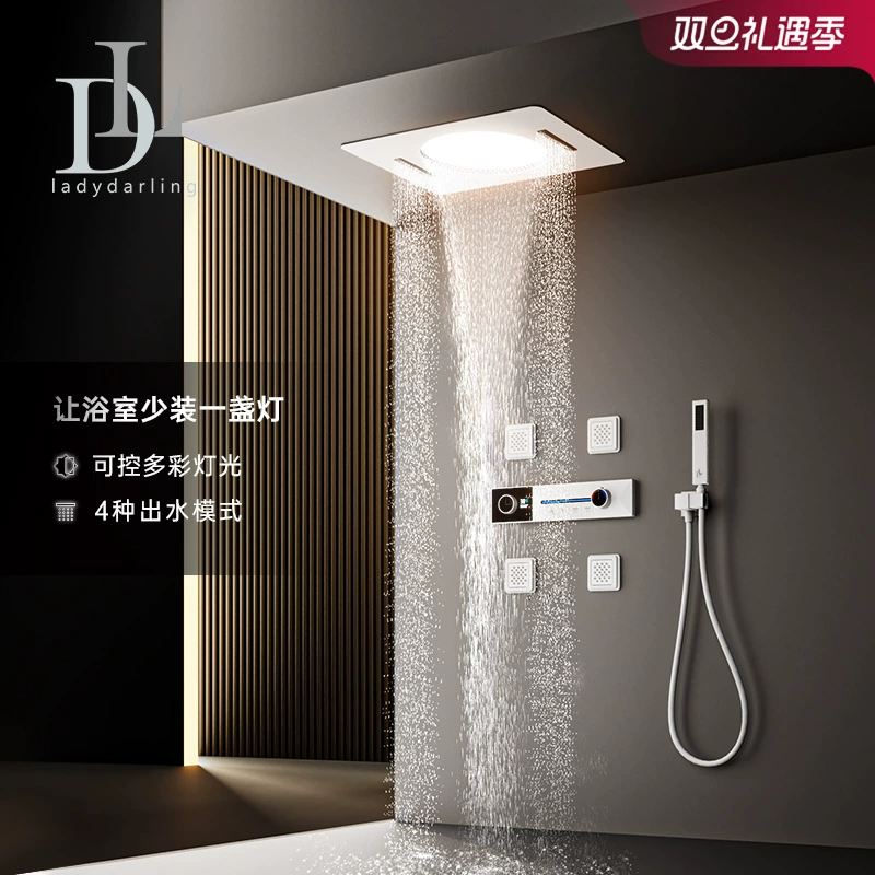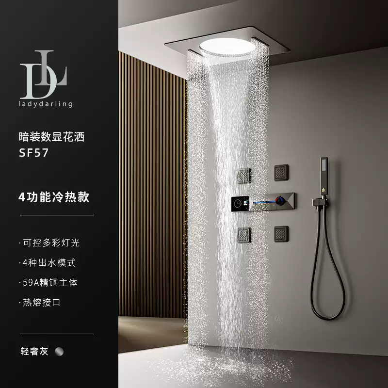 The German Leidedan Concealed Ceiling Waterfall Shower System is a premium, all-copper built-in thermostatic mixer designed for modern bathrooms, offering a luxurious and efficient showering experience. This shower set features a sleek, minimalist design with a concealed installation that hides the plumbing within the wall or ceiling, creating a clean and uncluttered aesthetic. The system includes a high-quality rain shower head that provides a gentle, waterfall-like flow for a relaxing and immersive shower, along with a handheld spray for versatile cleaning and targeted use. Made from durable, corrosion-resistant all-copper materials, it ensures long-lasting performance and reliability, while the thermostatic mixer maintains a consistent water temperature to prevent scalding and enhance safety. Ideal for contemporary homes, this shower set combines advanced technology with elegant styling, making it a perfect choice for those seeking both functionality and style in their bathroom fixtures. Its easy installation and low-maintenance design add to its appeal, providing a seamless upgrade to any bathroom decor.