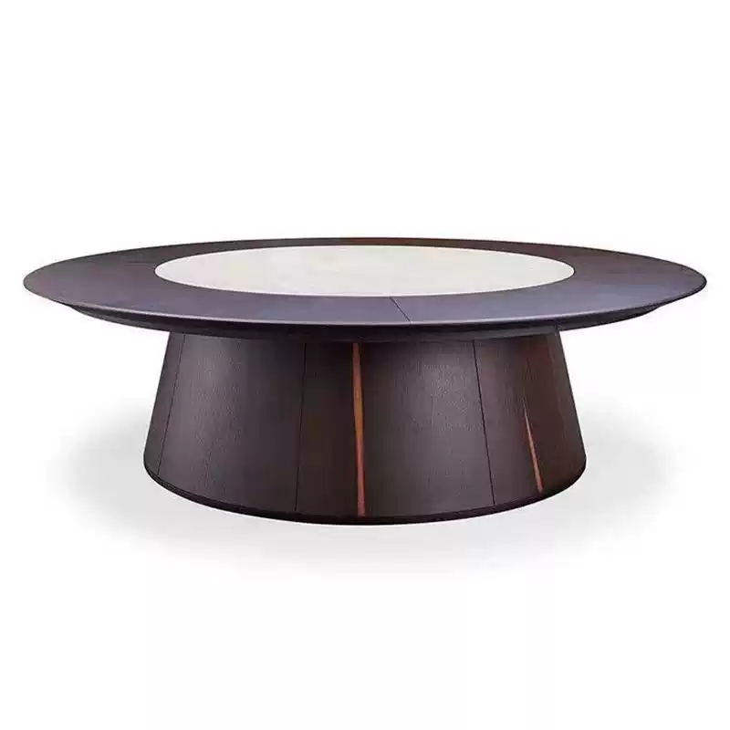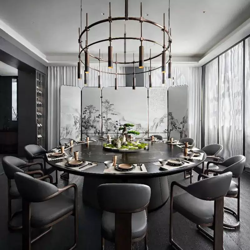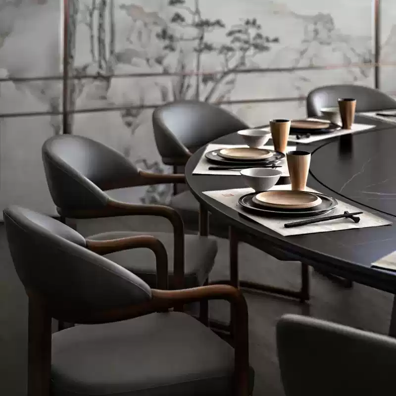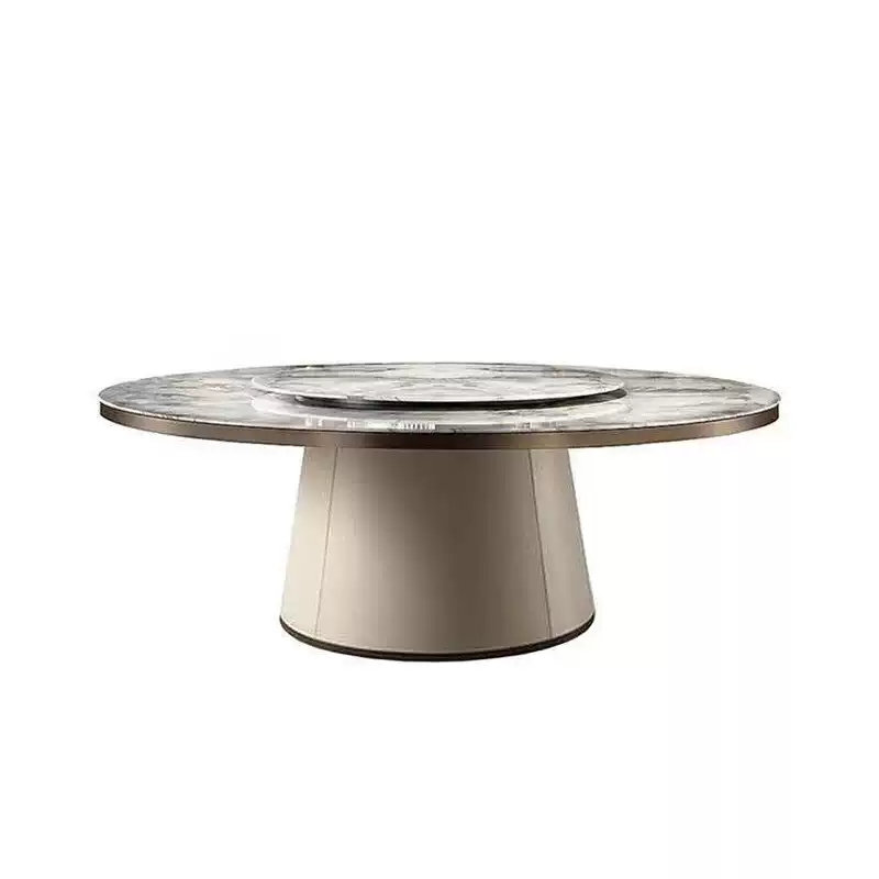 This elegant dining table set combines traditional Chinese aesthetics with modern functionality, making it an ideal choice for restaurants, hotels, and banquet halls. The table features a solid wood base and a 3cm thick marble top in a classic round shape, providing durability and a sophisticated look. The electric turntable at the center allows for easy sharing of dishes, enhancing the dining experience in group settings. The matching chairs are designed with comfort and style in mind, featuring sturdy construction and ergonomic seating. Crafted from high-quality materials, this set is built to withstand heavy use in commercial environments while maintaining its aesthetic appeal. Its neutral color palette and minimalist design make it versatile for various interior decors, from upscale dining rooms to casual eateries. The set promotes efficiency and convenience with the electric turntable, reducing the need for passing dishes manually. It is perfect for family gatherings, business meetings, or social events, offering a blend of practicality and elegance. Easy to assemble and maintain, this dining table set is a long-lasting investment for any hospitality or home setting, ensuring customer satisfaction and operational smoothness.