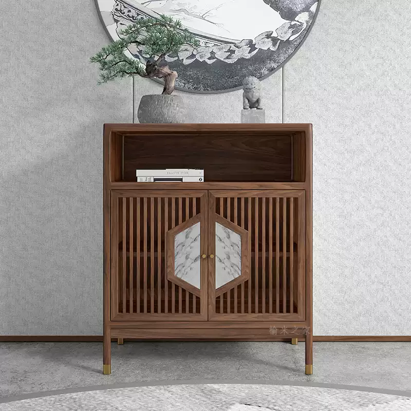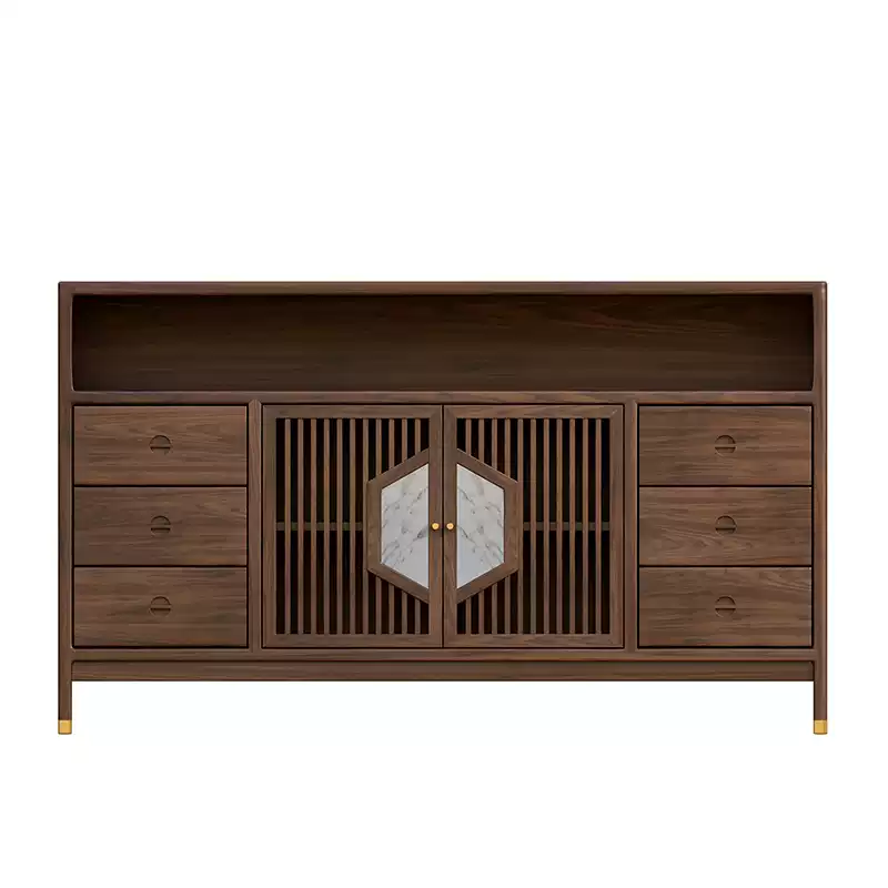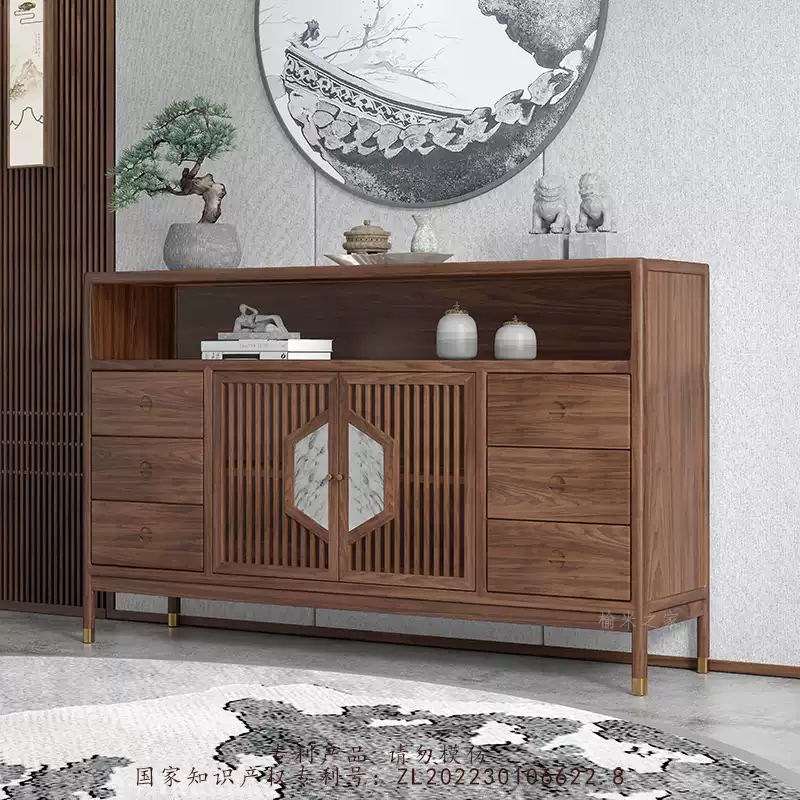 This exquisite dining sideboard combines modern aesthetics with traditional Chinese design elements, crafted from high-quality solid wood for durability and a luxurious feel. Featuring a rich black walnut finish, it adds a touch of sophistication to any space, making it ideal for both home and hotel settings. The cabinet includes multiple storage compartments, such as a spacious main cabinet, side drawers, and a low cabinet, providing ample room for organizing dining essentials, tableware, or decorative items. Its entryway-friendly design with subtle details enhances functionality while maintaining an elegant appearance. Perfect for enhancing dining areas, living rooms, or entry halls, this piece offers versatile storage solutions without compromising on style. The sturdy construction ensures long-lasting use, and the neutral color palette allows it to blend seamlessly with various interior decors. Elevate your space with this practical and stylish addition that prioritizes both form and function.