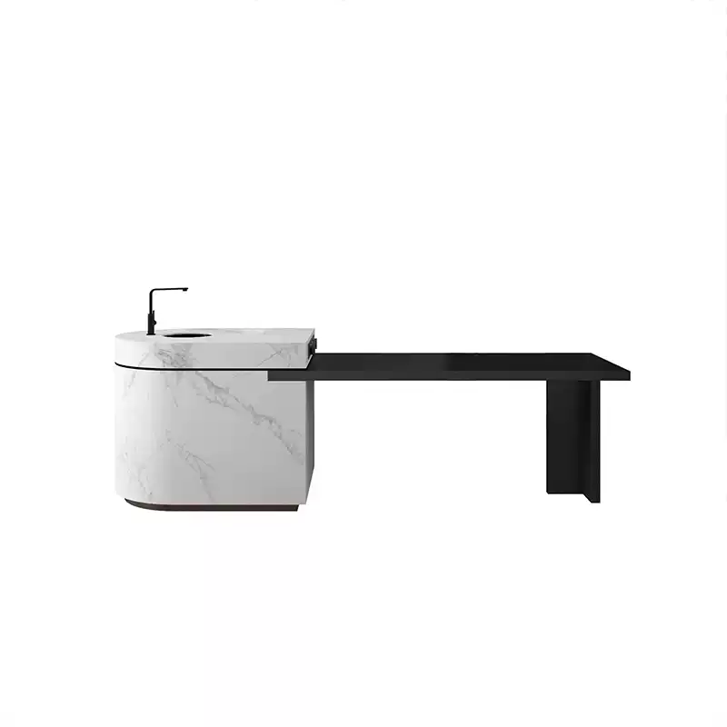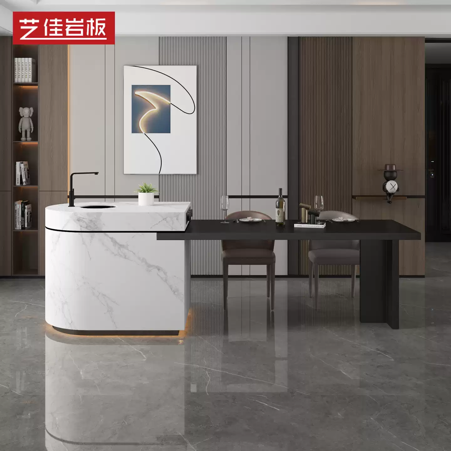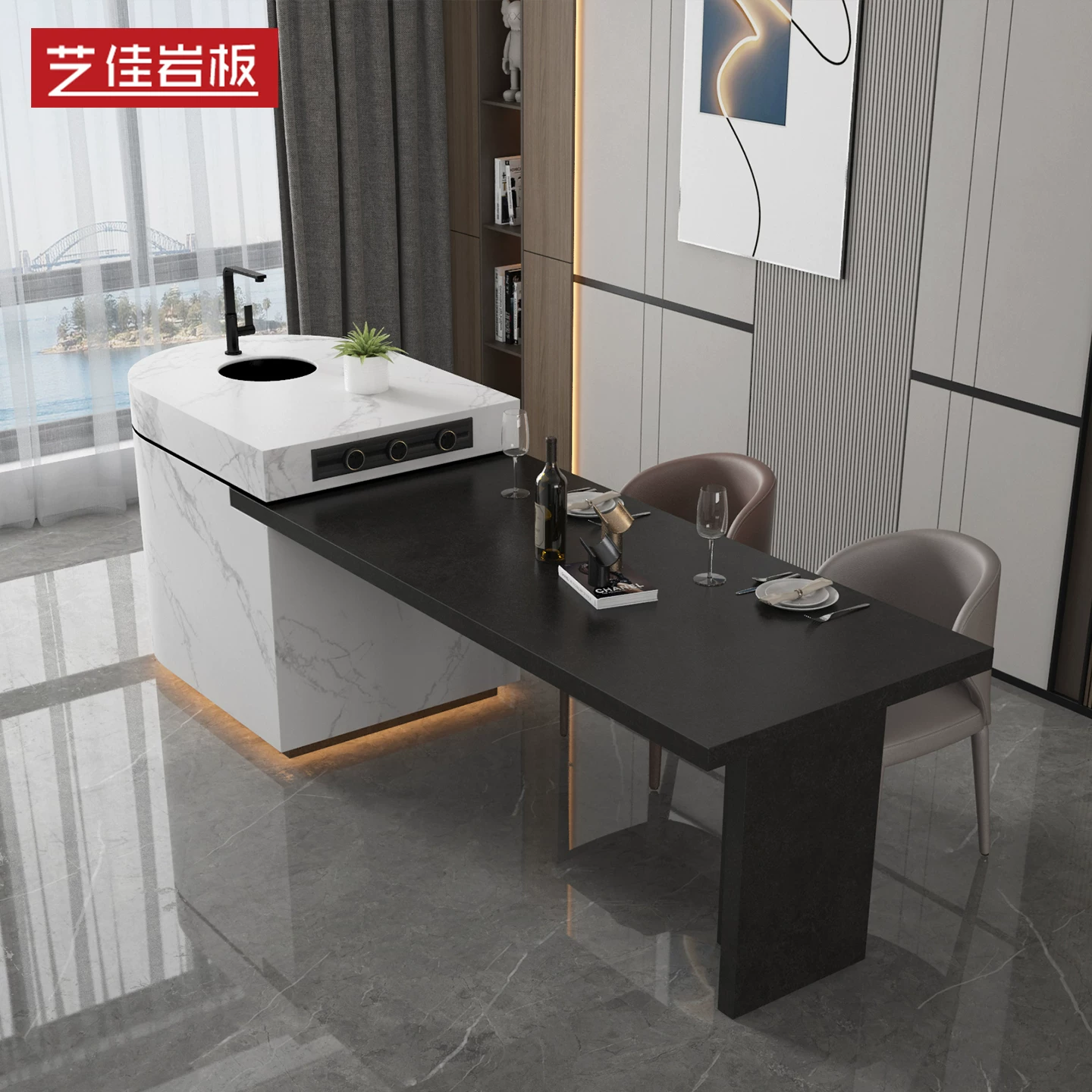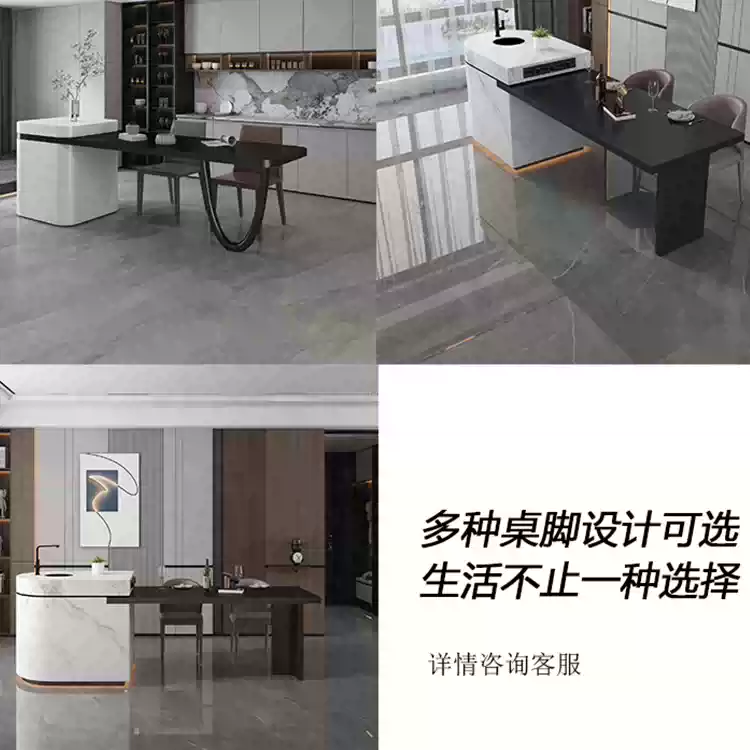 This kitchen island features a sleek, modern design with a curved, open-style structure that enhances the aesthetic appeal of any contemporary home. Crafted from durable materials, it includes an integrated sink and a water channel guide platform for efficient kitchen functionality. The minimalist and compact layout makes it ideal for small to medium-sized kitchens, offering a versatile space for dining, food preparation, and storage. Its customizable nature allows for tailored installations to fit specific kitchen layouts, promoting a seamless blend of style and practicality. With its ergonomic design and high-quality construction, this island is perfect for enhancing home cooking experiences while adding a touch of elegance to your living space.