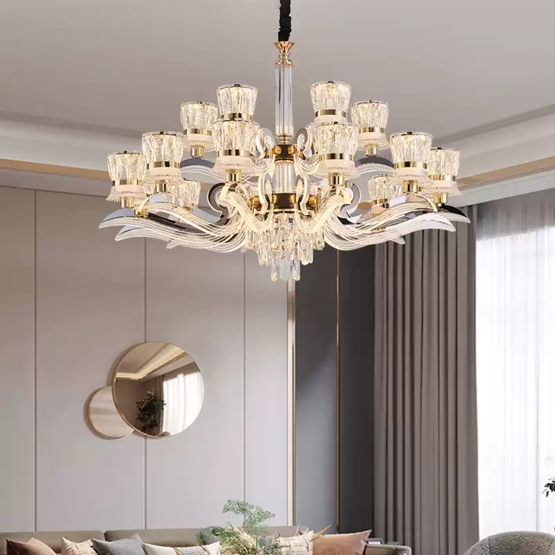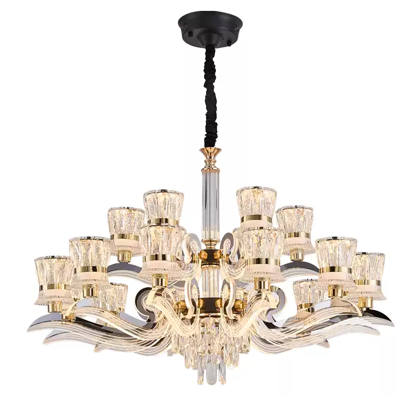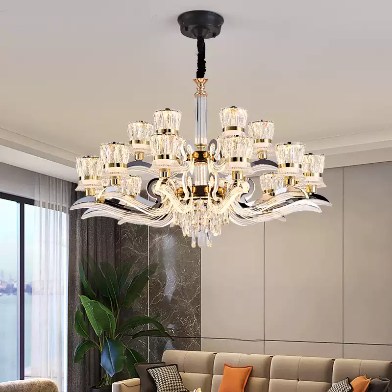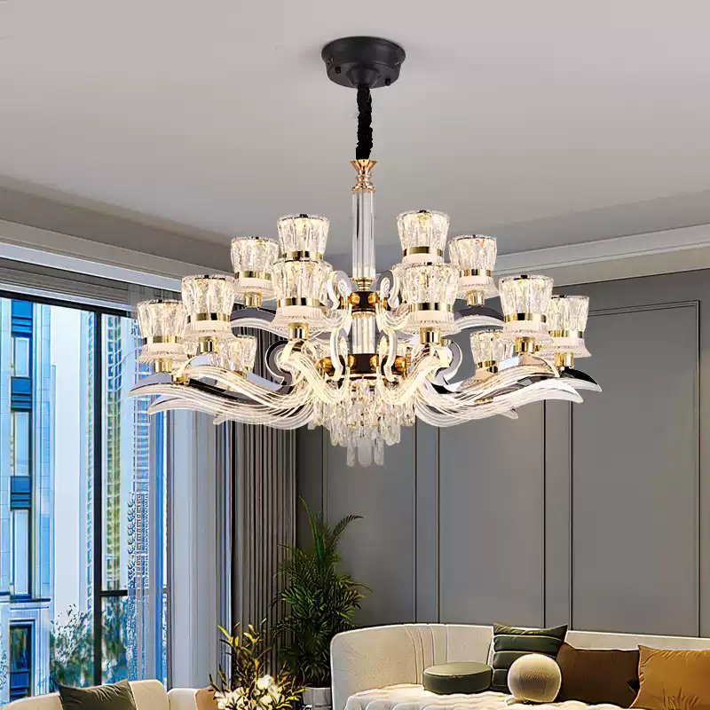 This 2025 new model crystal chandelier from Dengguan Home is a stunning addition to any modern living room or dining area, designed to exude luxury and sophistication. Featuring a sleek, contemporary style with a large, eye-catching frame, it combines elegance with functionality. The chandelier is adorned with numerous crystal drops that create a beautiful waterfall effect, reflecting light to enhance the ambiance of your space. Its adjustable arms allow for customizable lighting arrangements, making it versatile for various room layouts. Crafted from high-quality materials, including durable metal and premium crystals, this light fixture ensures long-lasting performance and a radiant glow. Ideal for enhancing home decor, it provides ample illumination while serving as a focal point in any interior setting. With its modern design and luxurious appeal, this chandelier is perfect for those seeking to add a touch of grandeur to their living or dining rooms, offering both aesthetic charm and practical lighting solutions.