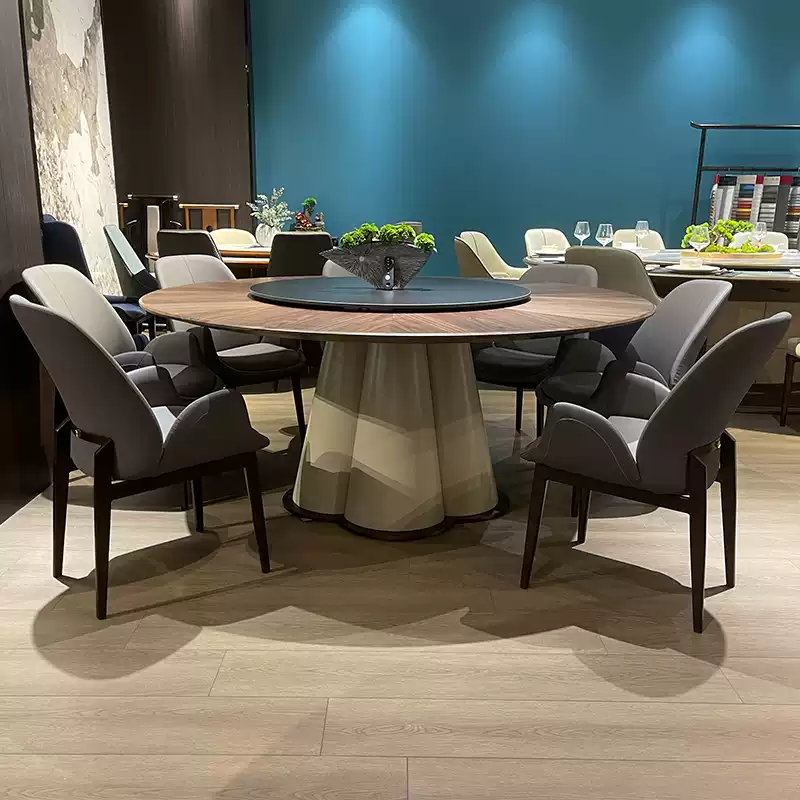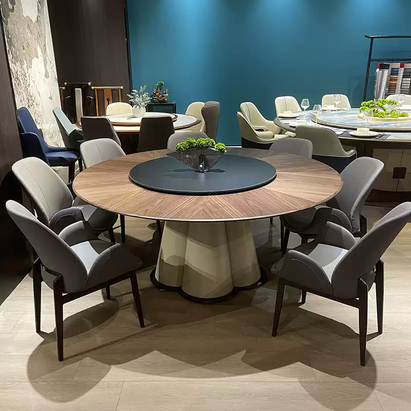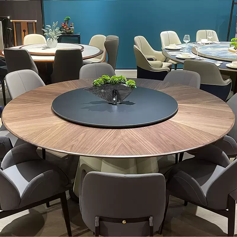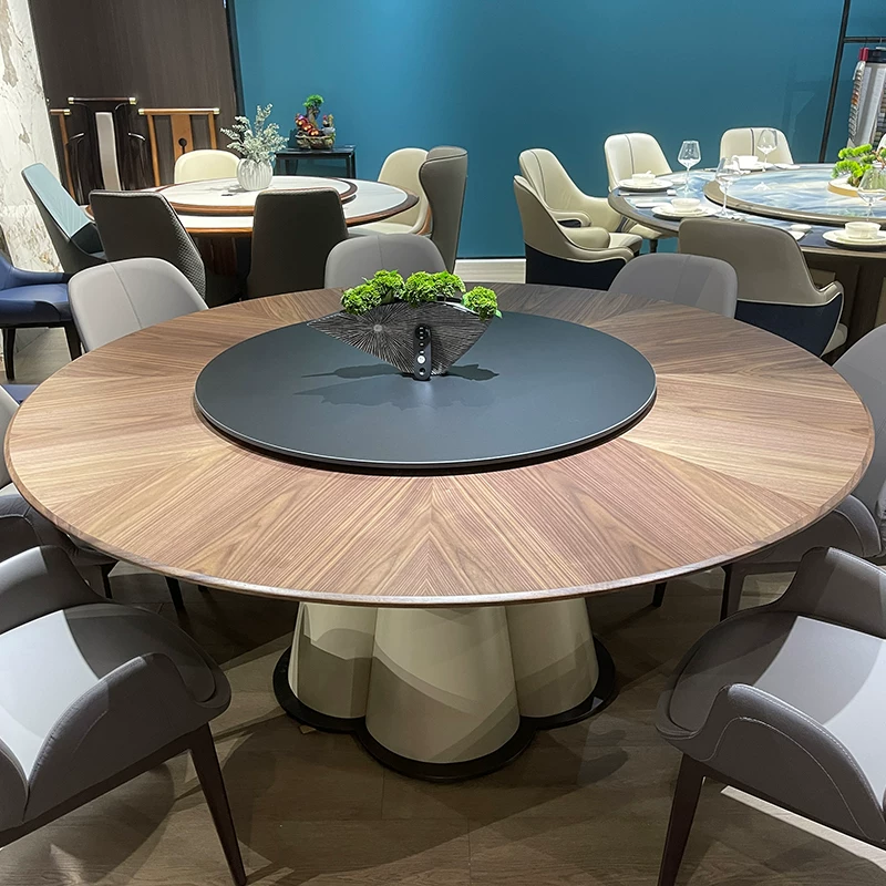 This premium electric dining table is designed for luxury hotels, upscale restaurants, banquet halls, and modern dining rooms, featuring a large 2.7-meter round tabletop with a sophisticated marble turntable for elegant and convenient dining experiences. Crafted with high-quality materials, the table showcases a sleek and contemporary design that enhances any dining space, offering both functionality and aesthetic appeal. The electric mechanism allows for smooth and quiet rotation of the turntable, making it ideal for serving multiple dishes effortlessly during banquets, family gatherings, or fine dining events. The marble turntable adds a touch of luxury and durability, resistant to stains and easy to clean, while the sturdy base ensures stability and safety. With its neutral color palette and minimalist style, this dining table complements various interior decors, from modern to classic, providing a versatile solution for hospitality and residential settings. Perfect for enhancing customer satisfaction in hotels and restaurants, it promotes efficient service and a memorable dining atmosphere. The table is engineered for long-lasting performance, with energy-efficient electric components and user-friendly controls, making it a practical investment for businesses seeking to elevate their dining offerings. Its spacious design accommodates large groups, fostering social interaction and comfort, while the premium finish reflects attention to detail and quality craftsmanship. This product is an excellent choice for those looking to combine luxury, convenience, and modern design in their dining spaces.