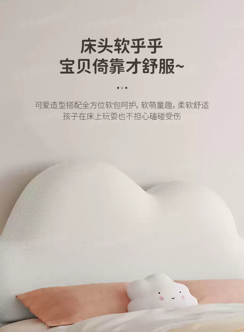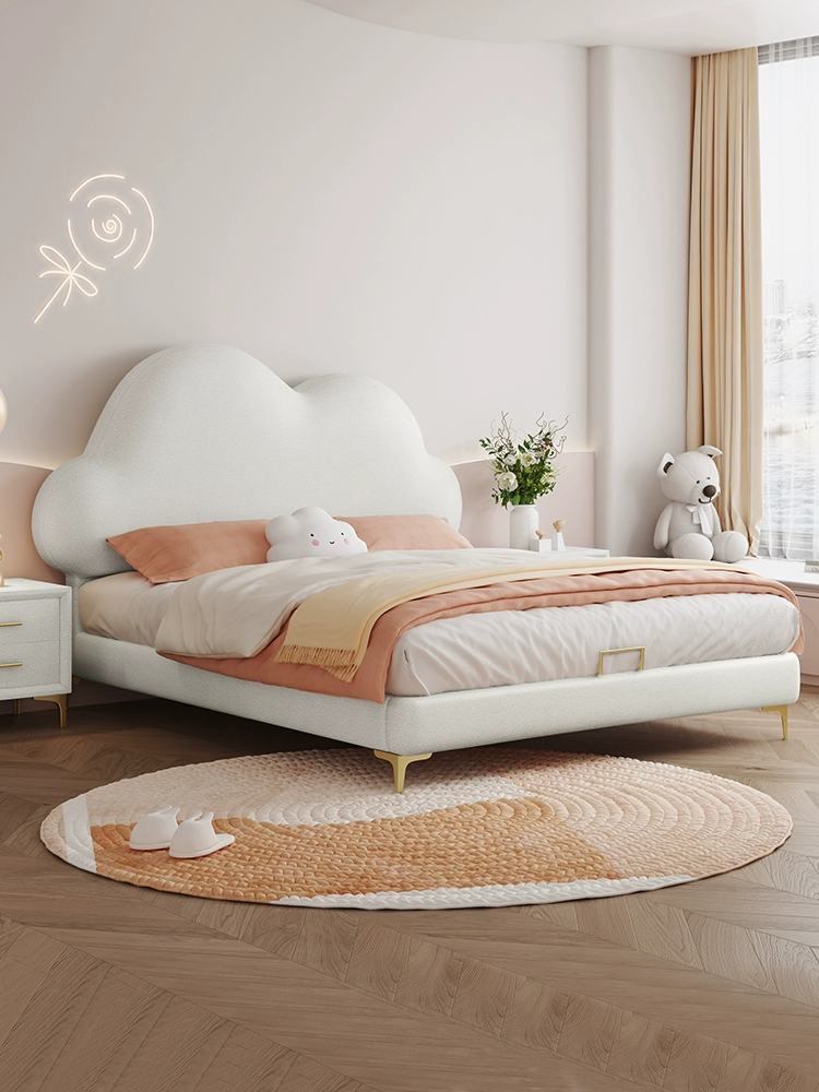 This modern minimalist children’s bed features a charming cloud design, making it an ideal choice for kids’ bedrooms. Crafted from high-quality solid wood, it ensures durability and stability, while the soft upholstery provides a comfortable and safe sleeping environment. The bed is designed with a simple yet elegant style, suitable for both boys and girls, with a princess theme that adds a touch of whimsy to any room. Its single bed size makes it perfect for personal spaces, offering a cozy retreat for children. The cloud-shaped headboard and footboard create a playful and soothing atmosphere, promoting relaxation and sweet dreams. This bed combines functionality with aesthetic appeal, featuring a sturdy construction that supports healthy sleep habits. The neutral color palette allows for easy integration into various bedroom decors, from contemporary to classic styles. It is an excellent investment for parents seeking a durable, stylish, and child-friendly bed that encourages imagination and comfort. With its focus on safety, quality materials, and modern design, this bed is a top choice for enhancing children’s bedrooms with a touch of magic and practicality.