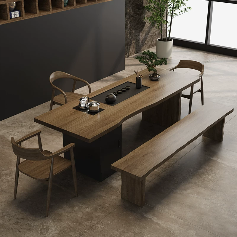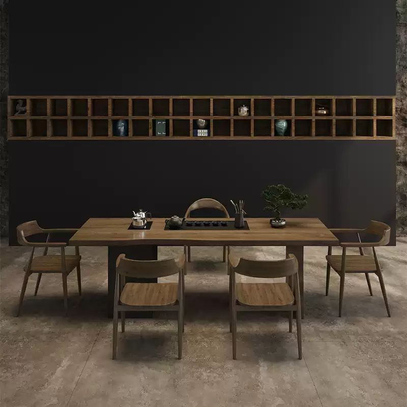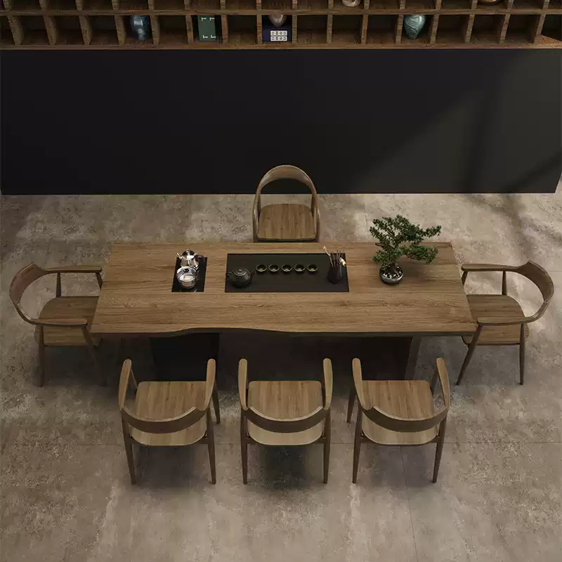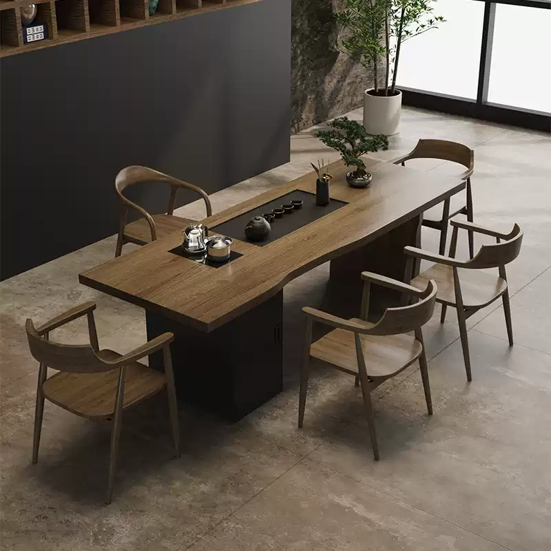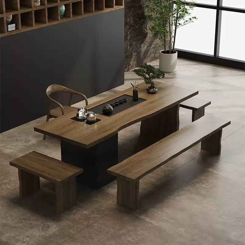 This exquisite solid wood tea table set combines traditional Chinese tea ceremony aesthetics with contemporary minimalist design, creating a perfect centerpiece for any home. Crafted from high-quality solid wood, the set features a large rectangular tea table with an integrated tea tray, designed for both functionality and elegance. The modern simplified style emphasizes clean lines and natural textures, making it suitable for various interior decors from traditional to contemporary. The one-piece construction ensures durability and stability, while the spacious tabletop provides ample room for tea preparation, serving, and social gatherings. Ideal for tea enthusiasts, this set enhances the tea-drinking experience with its practical design and aesthetic appeal. The new Chinese style incorporates subtle cultural elements without overwhelming the minimalist approach, offering a harmonious blend of tradition and modernity. Perfect for living rooms, study rooms, or dedicated tea spaces, this furniture set is built to last with attention to detail and craftsmanship. Its neutral color palette and versatile design make it a timeless addition to any home, promoting relaxation and mindfulness through the art of tea.