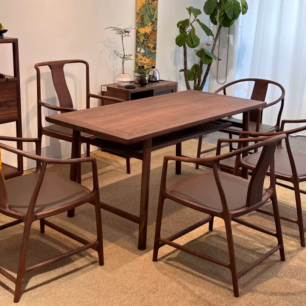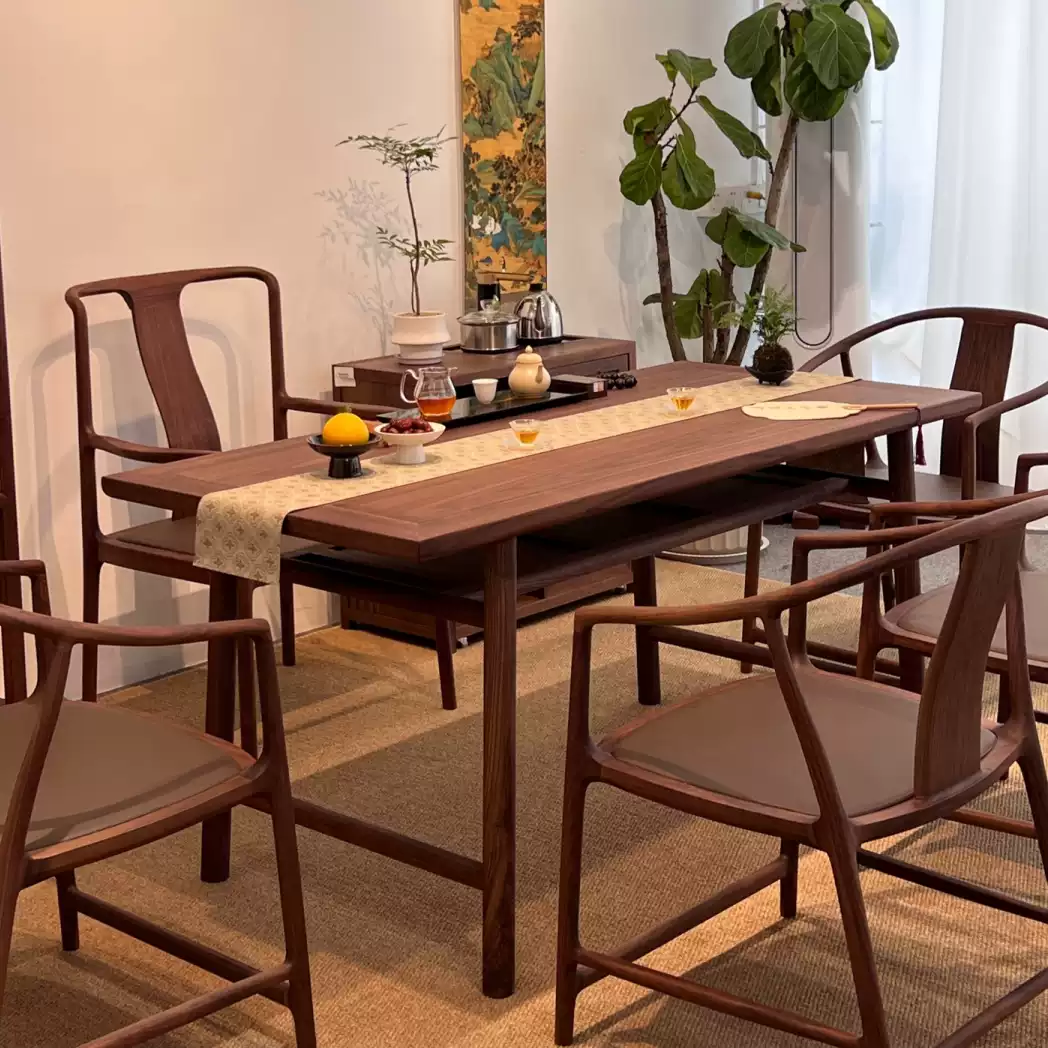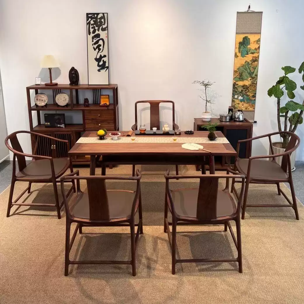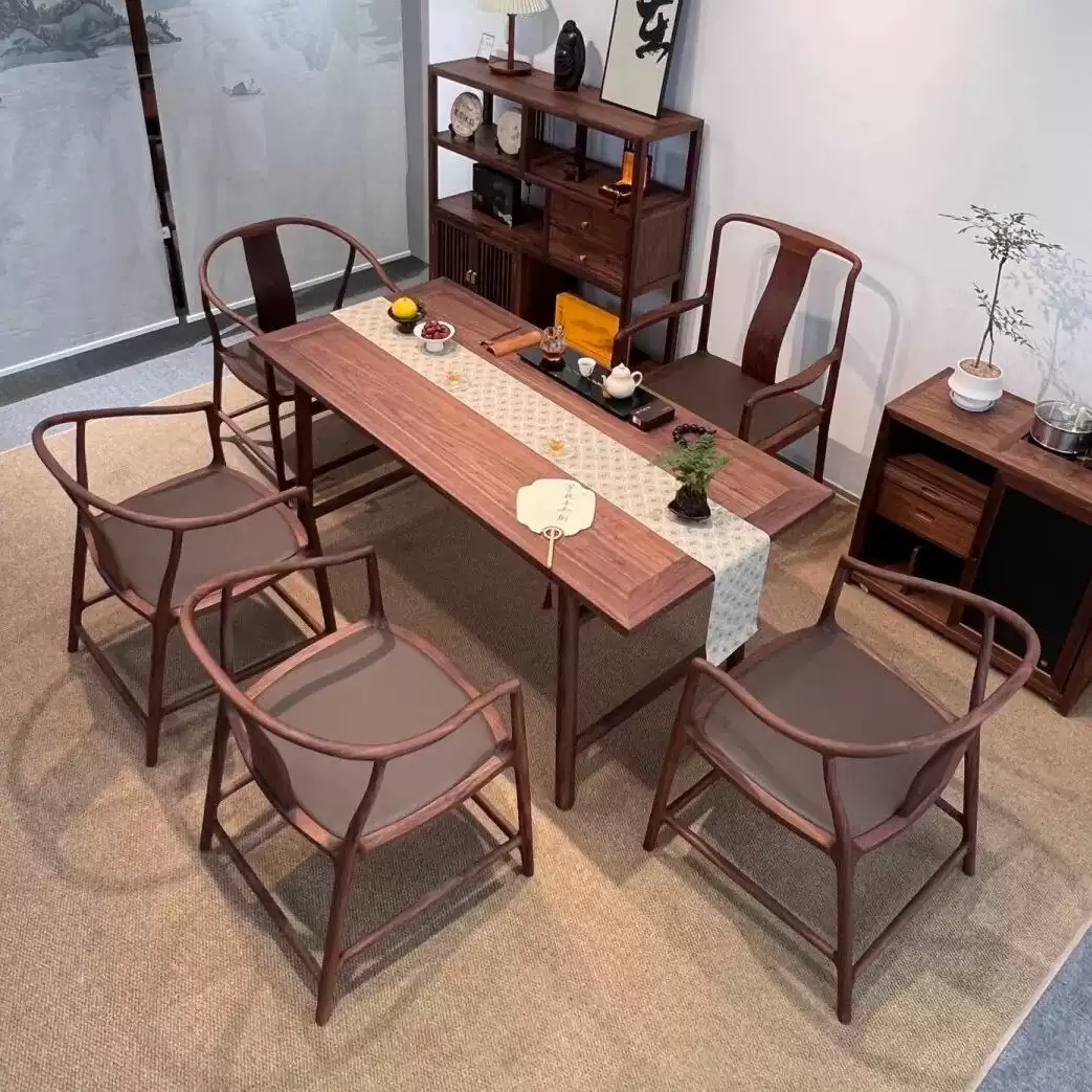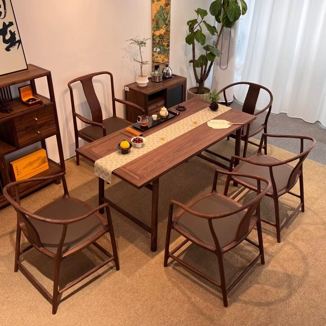 This exquisite tea table set combines modern aesthetics with traditional Zen elements, crafted from high-quality solid North American black walnut wood for durability and a natural, elegant finish. The set includes a long rectangular tea table and matching benches, designed to create a serene and harmonious atmosphere perfect for meditation, tea ceremonies, or casual gatherings on balconies, patios, or indoor spaces. The minimalist yet sophisticated design features clean lines and a rich dark walnut color that enhances any decor, while the sturdy construction ensures long-lasting use. Ideal for those seeking a peaceful retreat, this set promotes relaxation and mindfulness with its practical layout and eco-friendly materials. Its versatile size accommodates multiple users, making it a great addition to homes, offices, or outdoor settings where style and functionality are prioritized.