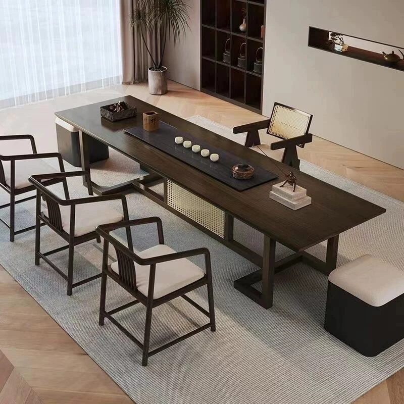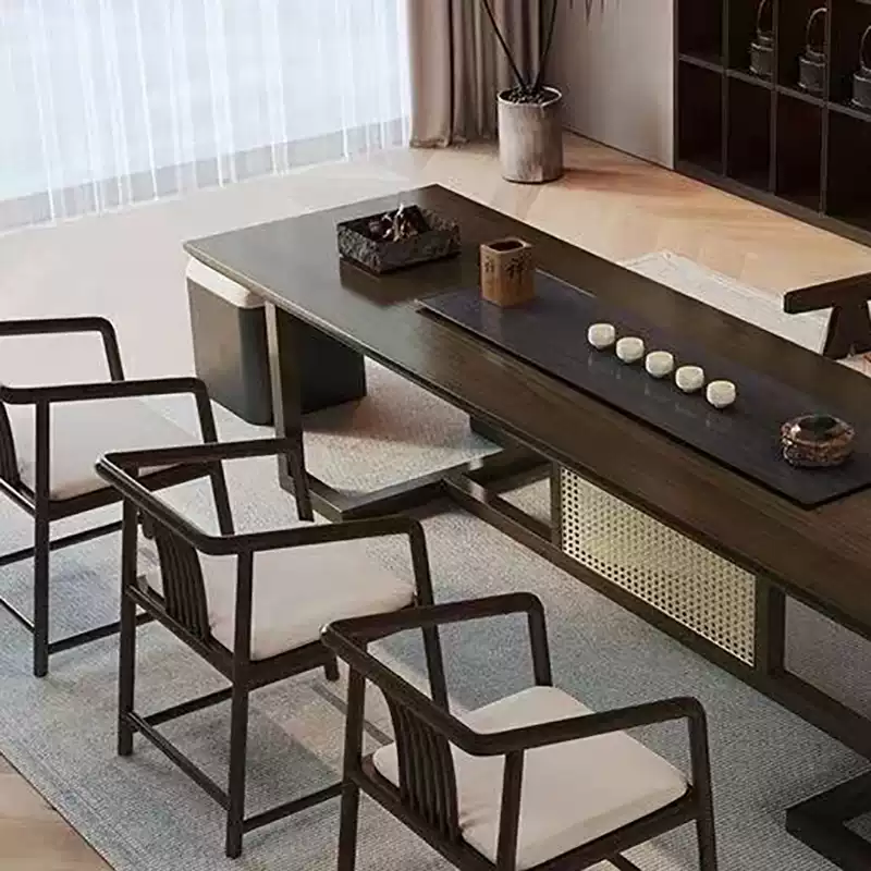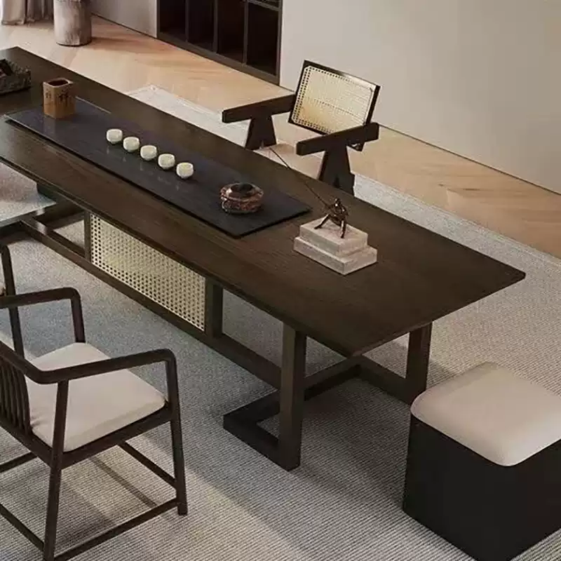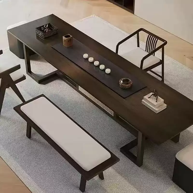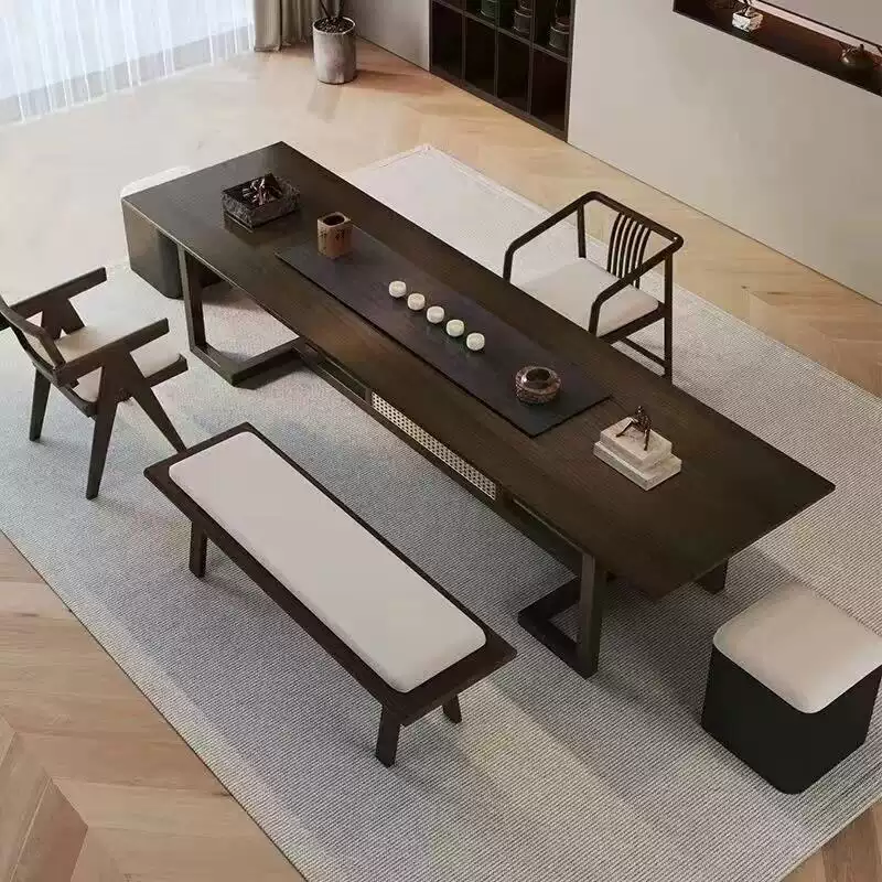 This elegant tea table and stool set combines traditional Chinese aesthetics with modern functionality, making it a perfect addition to various settings such as offices, hotels, homestays, villas, and tea rooms. Crafted from high-quality black walnut wood, the set features a rich, dark finish that exudes sophistication and durability. The white wax wood accents add a subtle contrast, enhancing the overall visual appeal. The design emphasizes a leisure and relaxed atmosphere, ideal for tea ceremonies, casual meetings, or quiet moments of reflection. The table and stools are designed with ergonomic considerations, ensuring comfort during prolonged use. The sturdy construction guarantees long-lasting performance, while the natural wood grain patterns provide a unique, rustic charm. This set not only serves as practical furniture but also as a decorative piece that elevates the ambiance of any space. Its versatile style allows it to blend seamlessly with both contemporary and traditional interiors, making it a popular choice for those seeking a harmonious balance between beauty and utility. Perfect for enhancing productivity in offices or creating a cozy retreat in residential settings, this tea table and stool set is a timeless investment in quality and style.