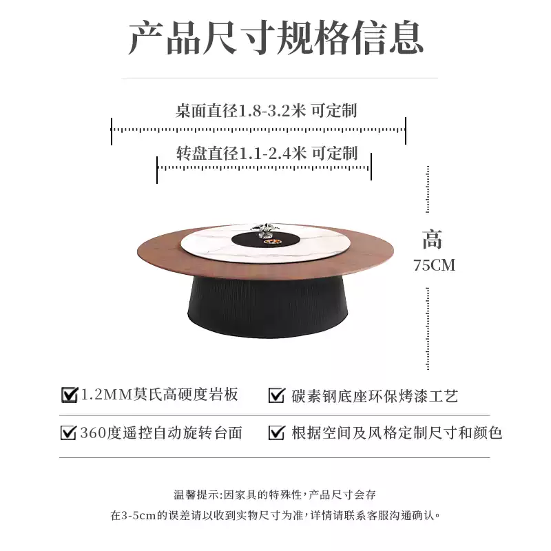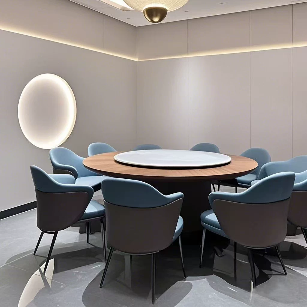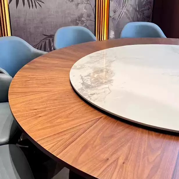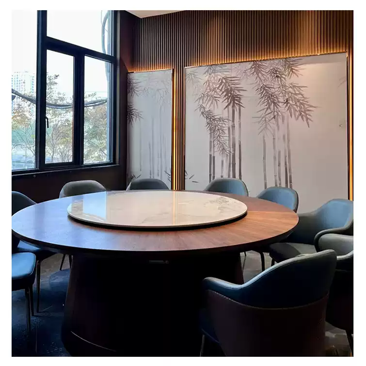 This New Chinese Style Hotel Restaurant Electric Lazy Susan Large Round Table is designed for up to 15 to 20 people, making it ideal for dining rooms, banquets, and large gatherings. The table features a 2-meter diameter round top with a built-in electric lazy Susan turntable, allowing for convenient and efficient serving of dishes in a communal dining setting. Crafted in a modern Chinese aesthetic, it combines traditional elegance with contemporary functionality, suitable for hotels, restaurants, and banquet halls. The sturdy construction ensures durability and stability, while the electric mechanism provides smooth and quiet rotation. This table enhances the dining experience by promoting interaction and ease of access to food, perfect for family meals, business dinners, and special events. Its spacious design accommodates multiple guests comfortably, and the stylish appearance adds a touch of sophistication to any dining space. Easy to operate and maintain, this electric lazy Susan table is a practical and attractive addition to any hospitality or home setting.