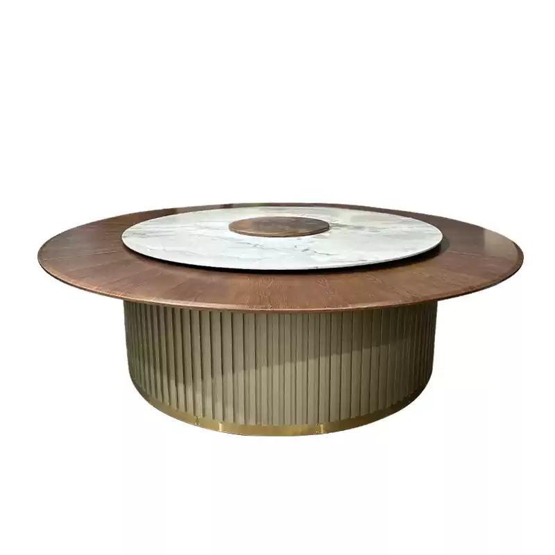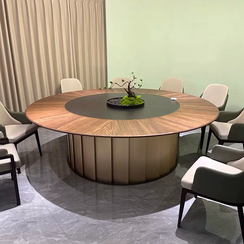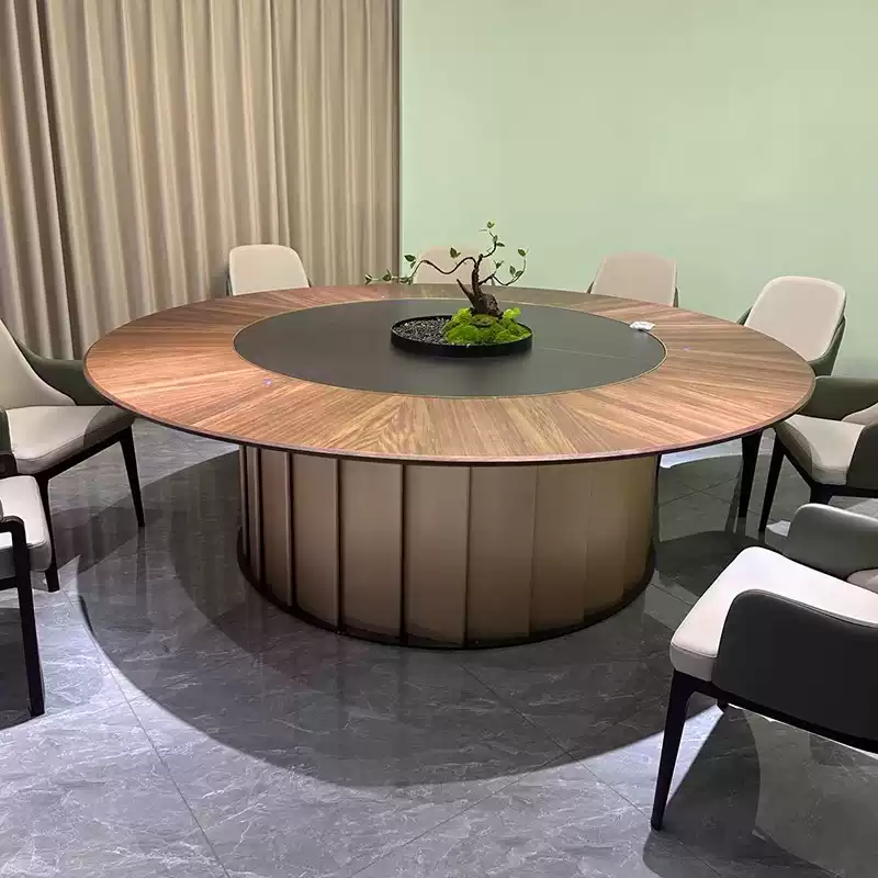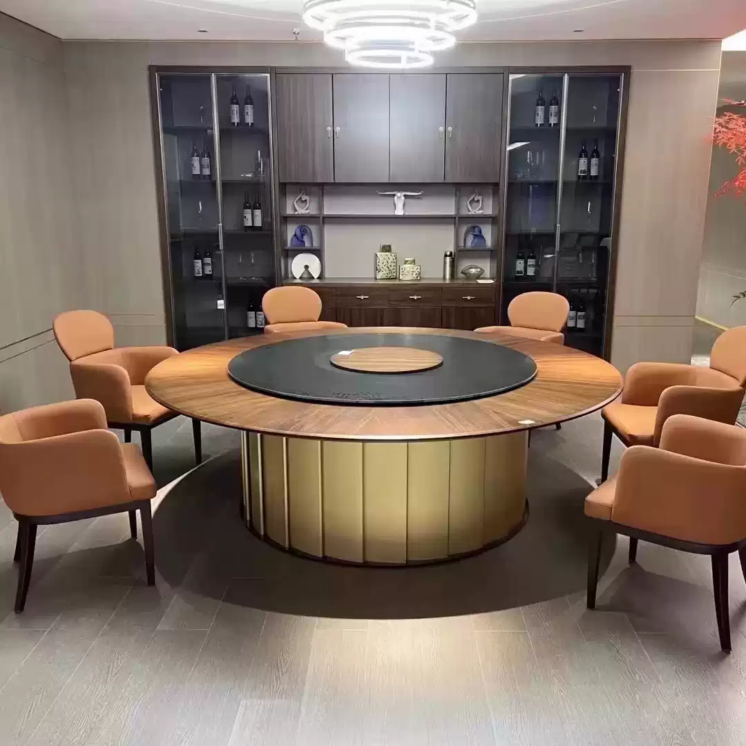 This high-end electric lazy Susan dining table set is designed for luxury hotels, banquet halls, and fine dining restaurants, featuring a spacious 2.2m x 3m large round tabletop with a smooth marble-style finish that enhances any upscale dining environment. The table includes an integrated electric rotating mechanism, allowing for effortless sharing of dishes among up to 20 guests, making it ideal for large gatherings, corporate events, and family celebrations. Crafted from durable materials, the table ensures stability and longevity, while the accompanying 20 chairs are ergonomically designed with plush upholstery in neutral tones to complement the table’s elegant aesthetic. The set promotes a seamless and interactive dining experience, reducing clutter and improving guest satisfaction in commercial or residential settings. Its modern design, combined with practical features like easy-to-clean surfaces and quiet operation, makes it a versatile choice for various occasions, from formal dinners to casual meals. This product is perfect for enhancing dining spaces with its sophisticated look and functional benefits, ensuring comfort and convenience for all users.