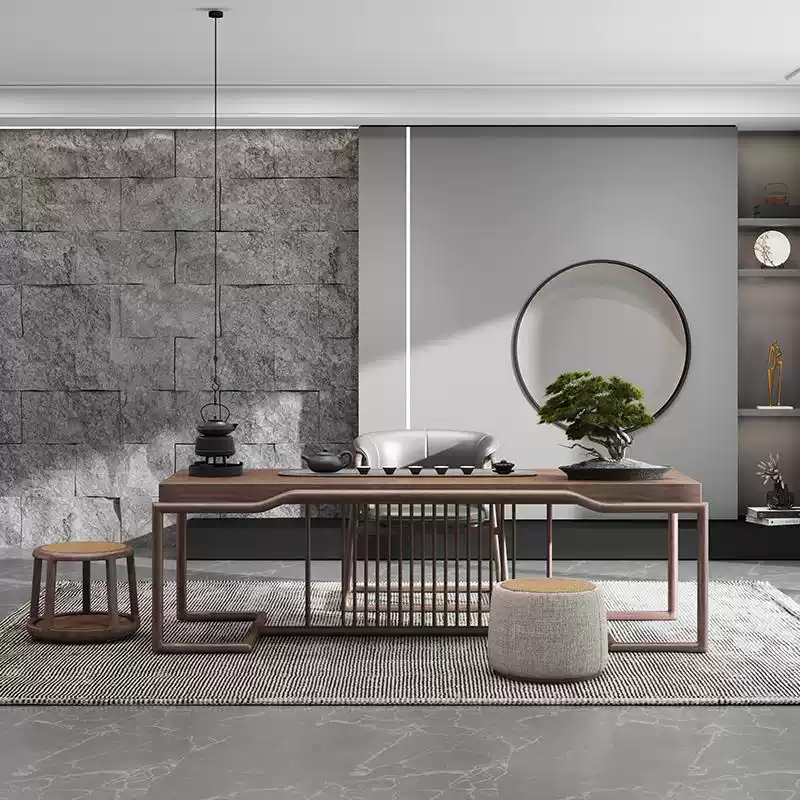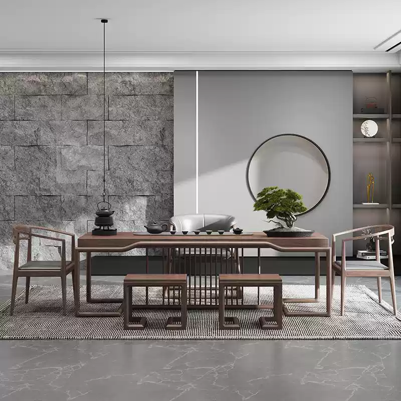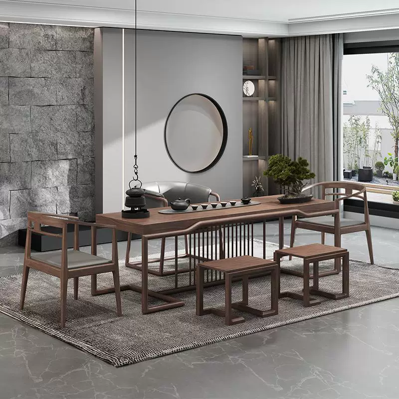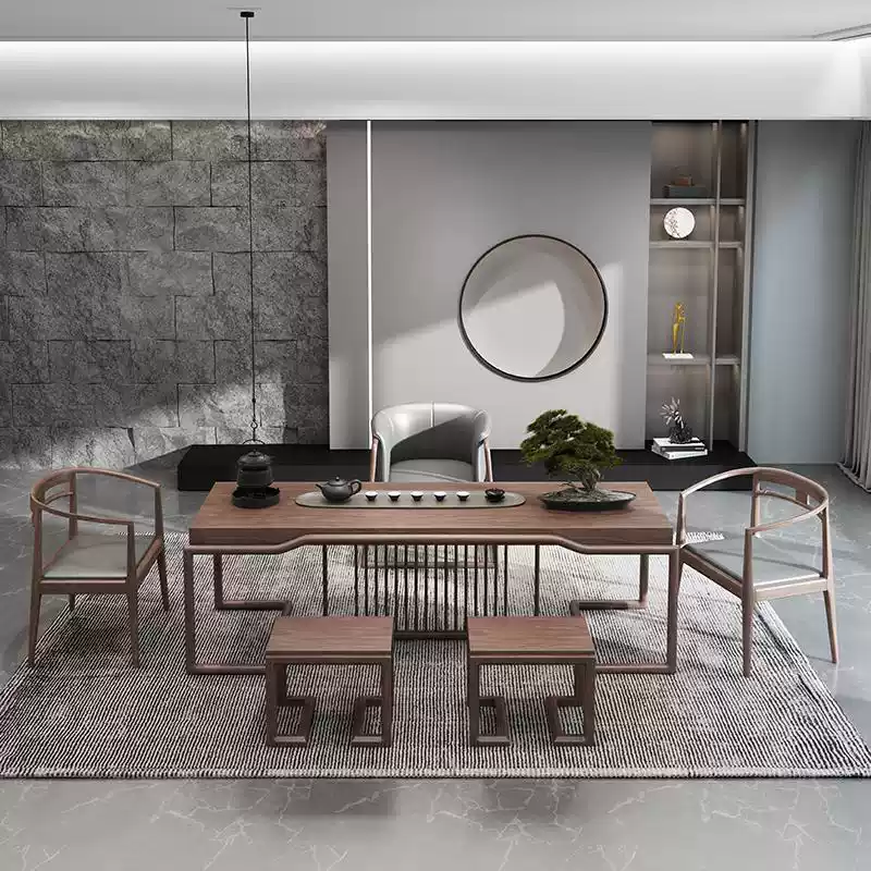 This exquisite tea table set features a sophisticated blend of modern and Zen-inspired aesthetics, crafted from high-quality North American black walnut wood known for its rich, dark tones and durable grain patterns. The set includes a tea table and matching chairs, designed to enhance spaces such as offices, living rooms, and tea rooms with an air of tranquility and luxury. The minimalist yet elegant design incorporates smooth curves and clean lines, promoting a serene atmosphere ideal for relaxation, meetings, or tea ceremonies. The natural wood finish highlights the unique texture of black walnut, offering a timeless appeal that complements various interior styles. With its sturdy construction and ergonomic seating, this set ensures comfort and durability, making it a perfect addition for those seeking a harmonious and high-end furniture solution. Ideal for enhancing productivity in professional settings or creating a peaceful retreat at home, it embodies a perfect fusion of art and utility.