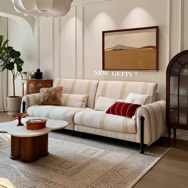 Vintage Wild Linen Art Sofa – Large Three-Seater Straight Row Retro Style Living Room Couch with Classic Stripes and Natural Fabric