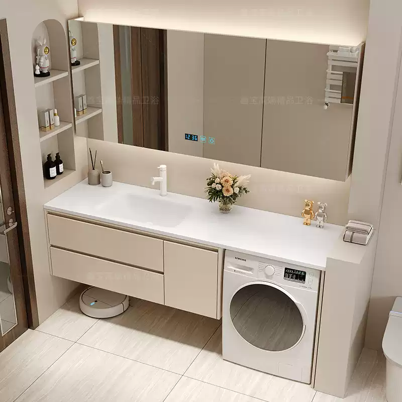 Custom Ceramic Wash Basin with Integrated Washing Machine and Cabinet – Seamless Bathroom Vanity Set for Modern Toilet and Shower Rooms