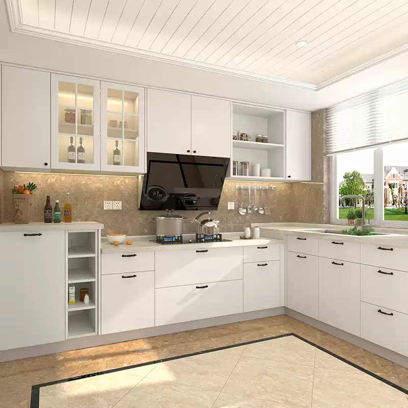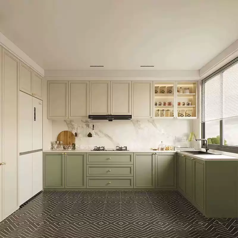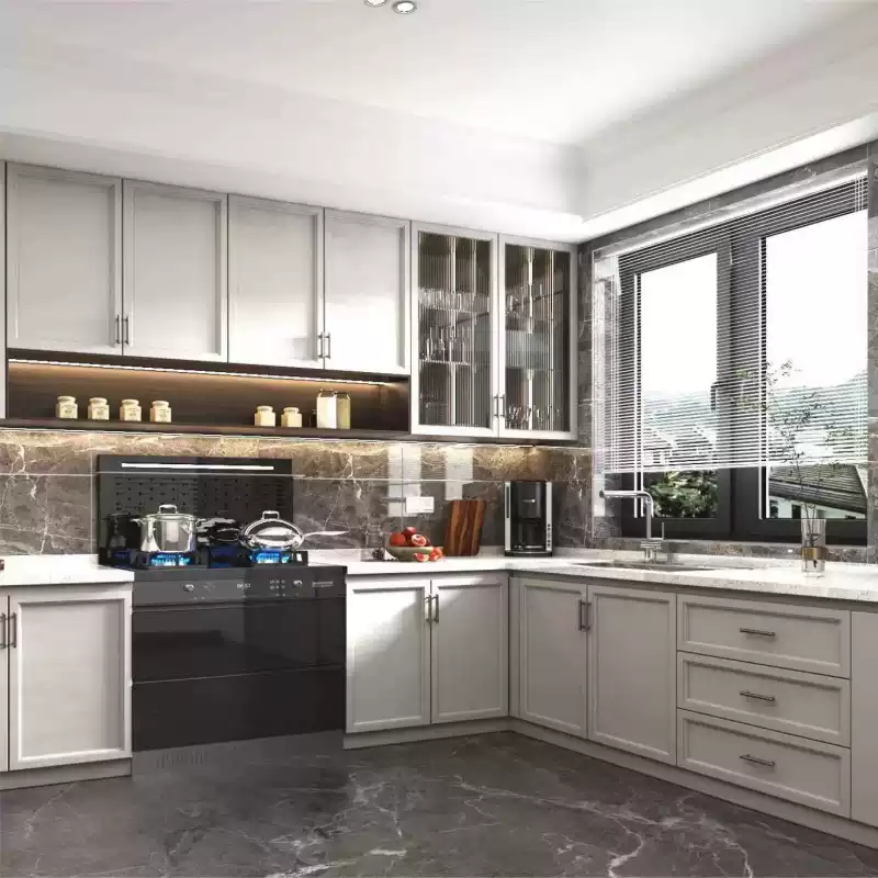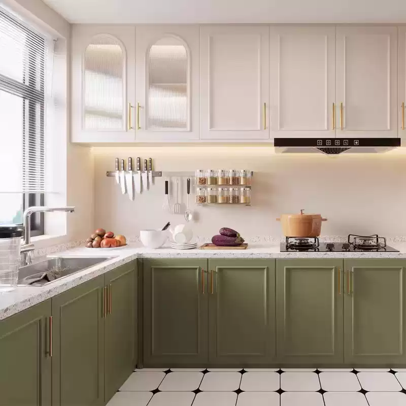 Custom Antibacterial Kitchen Cabinet with Gold Accents and Quartz Countertop – Premium Modular Kitchen Island Cabinet Set for Home Renovation