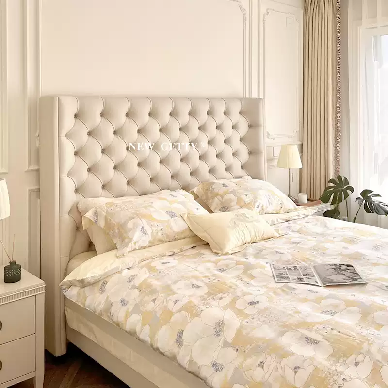 Nordic Style Tufted Button Fabric Upholstered Bed Frame with Solid Wood Structure – Elegant Retro Master Bedroom King Size Double Bed for Luxurious Comfort